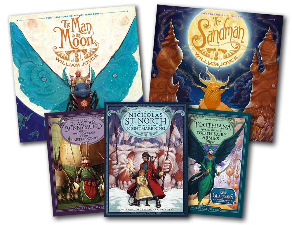 A luminous new book series from William Joyce that redefines the icons of childhood: Santa Claus, Easter Bunny, Tooth Fairy, Sandman, Man in the Moon and many more. Published by Simon & Schuster, these books explore the mythology of childhood legends through vividly illustrated picture books and chapter books for young adults. In November of 2012, the series became an animated feature film from DreamWorks Animation: Rise of the Guardians.[4]